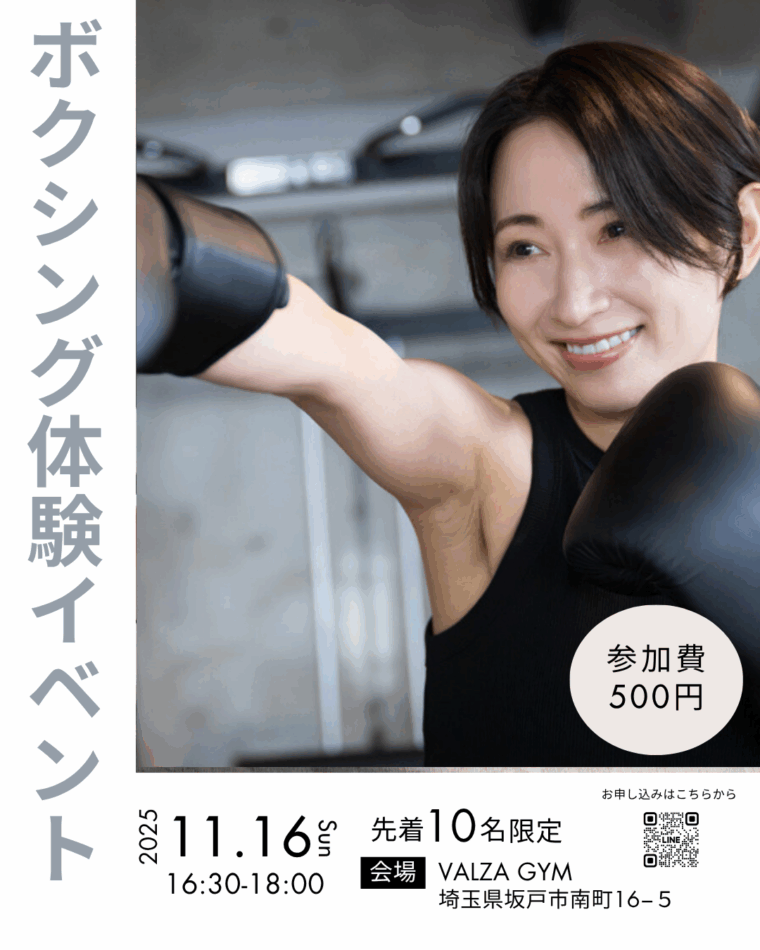 💥ボクシング体験イベント【第2弾】開催💥 開催日時:11月16日(日) 16:30〜18:00 開催場所:VALZAGYM (坂戸市南町16-5福栄ビル3F) 前回は、親子で […]